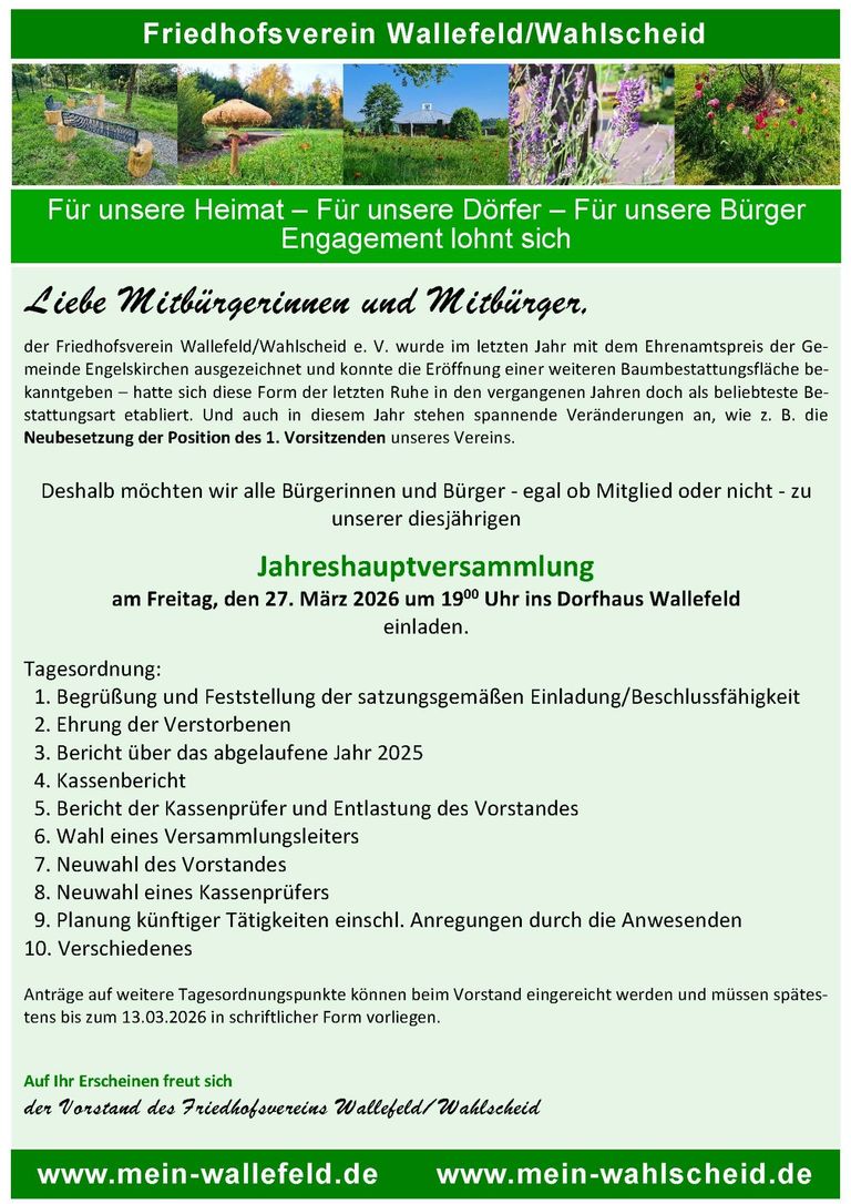 Das kleine, von Fachwerkhäusern geprägte, Dorf Wallefeld gehört zur Gemeinde Engelskirchen im Oberbergischen Kreis. Der ehemalige Kurort liegt ca. 7,7 km vom Hauptort Engels-kirchen entfernt.